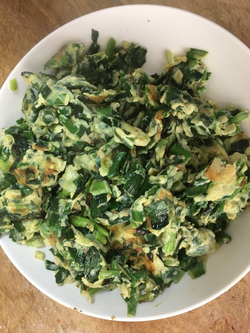6:炒到韭菜稍微变软时倒入鸡蛋块翻炒。
