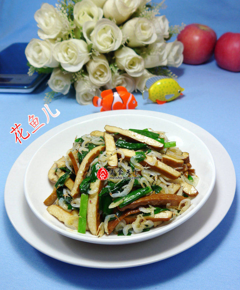 1:食材:香干、韭菜(已清洗切成段)、虾皮