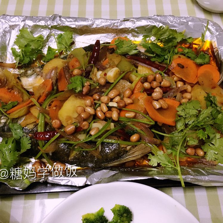 因为我的烤碗不是很大,鱼比较长没能完全放在烤碗里,如果烤盘大,也可以把鱼从肚皮开时对半切,不要切断,平摊在烤盘里,蔬菜的食材可以根据你个人的喜欢随意搭配,豆芽,土豆之类的都可以,酱料也可以根据自己的需要增减,不喜欢太辣的可以不抹辣椒粉,烤箱温度根据自己的烤箱温度调节