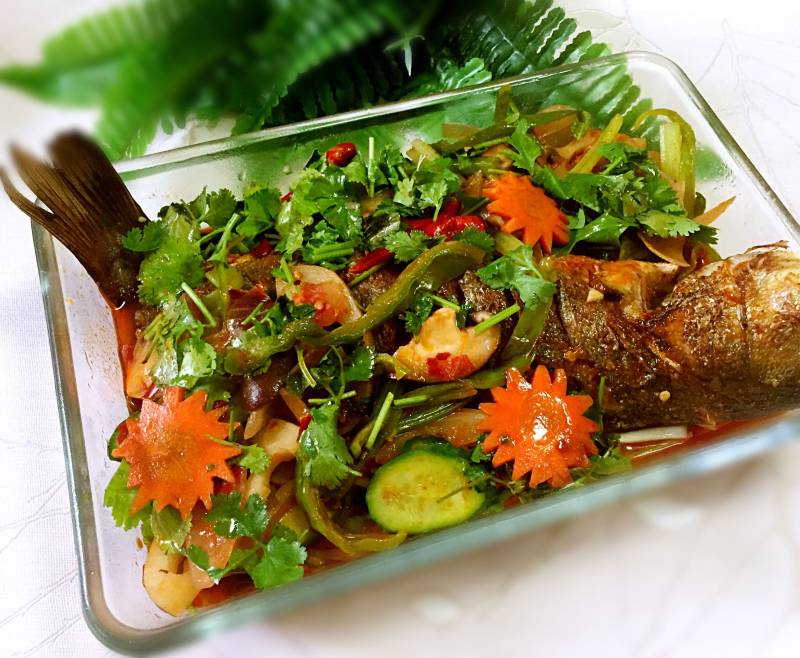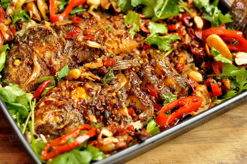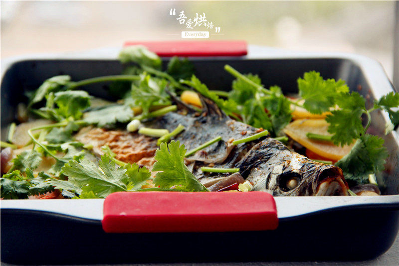 15:把炒好的菜放在烤盘最下面,考好的鱼放在上面,锅里倒油100克左右加热,把热油浇在鱼身上,撒上香菜即可