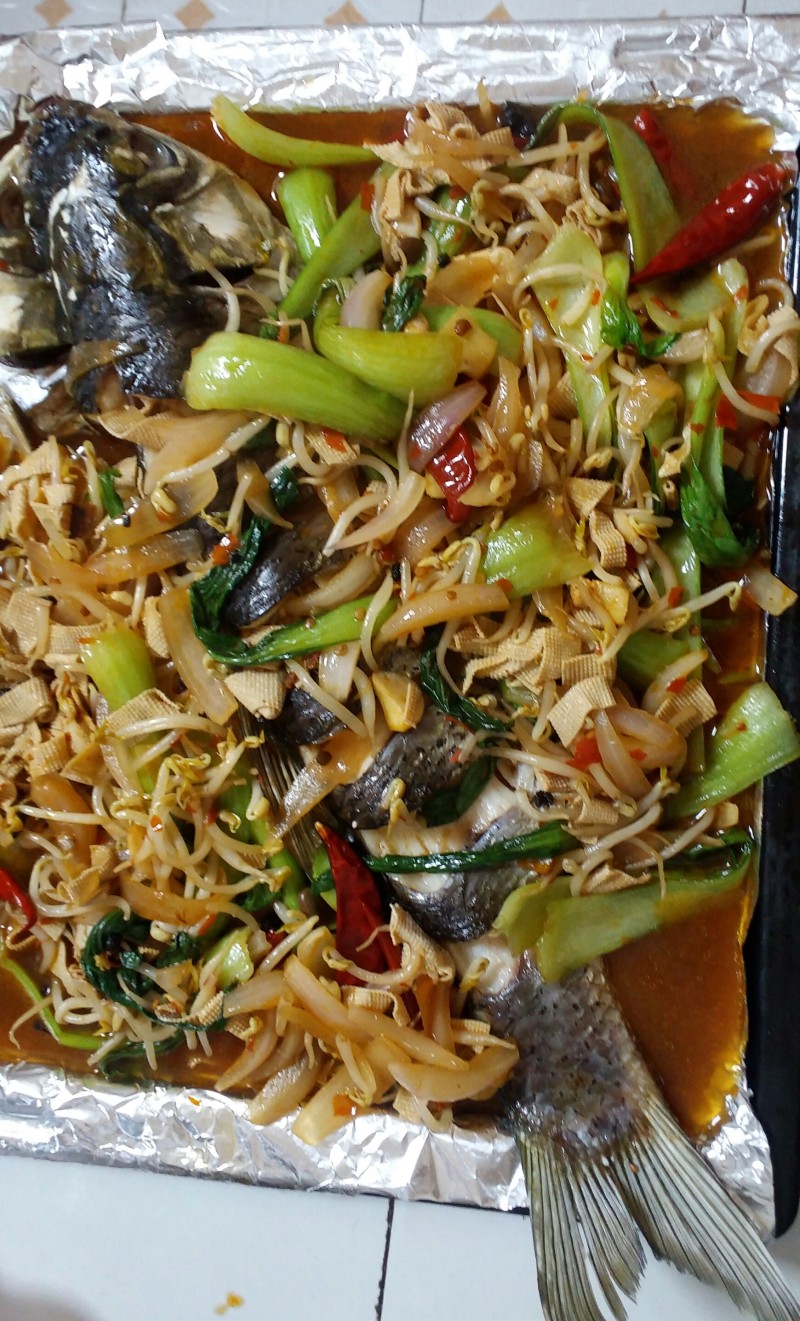 5:做准备工作的时候把烤箱200度预热,然后把表面也用锡纸包好,然后烤20分钟,到时间,拿出来,到上蒸鱼豉油调味,就好了,
