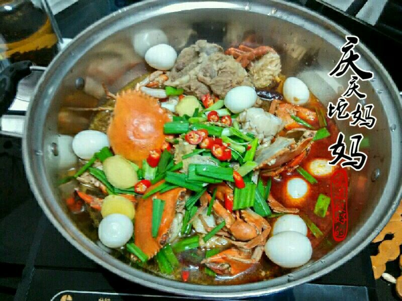 煮螃蟹的汤最好用筒子骨炖的高汤,味道鲜又补钙哦!