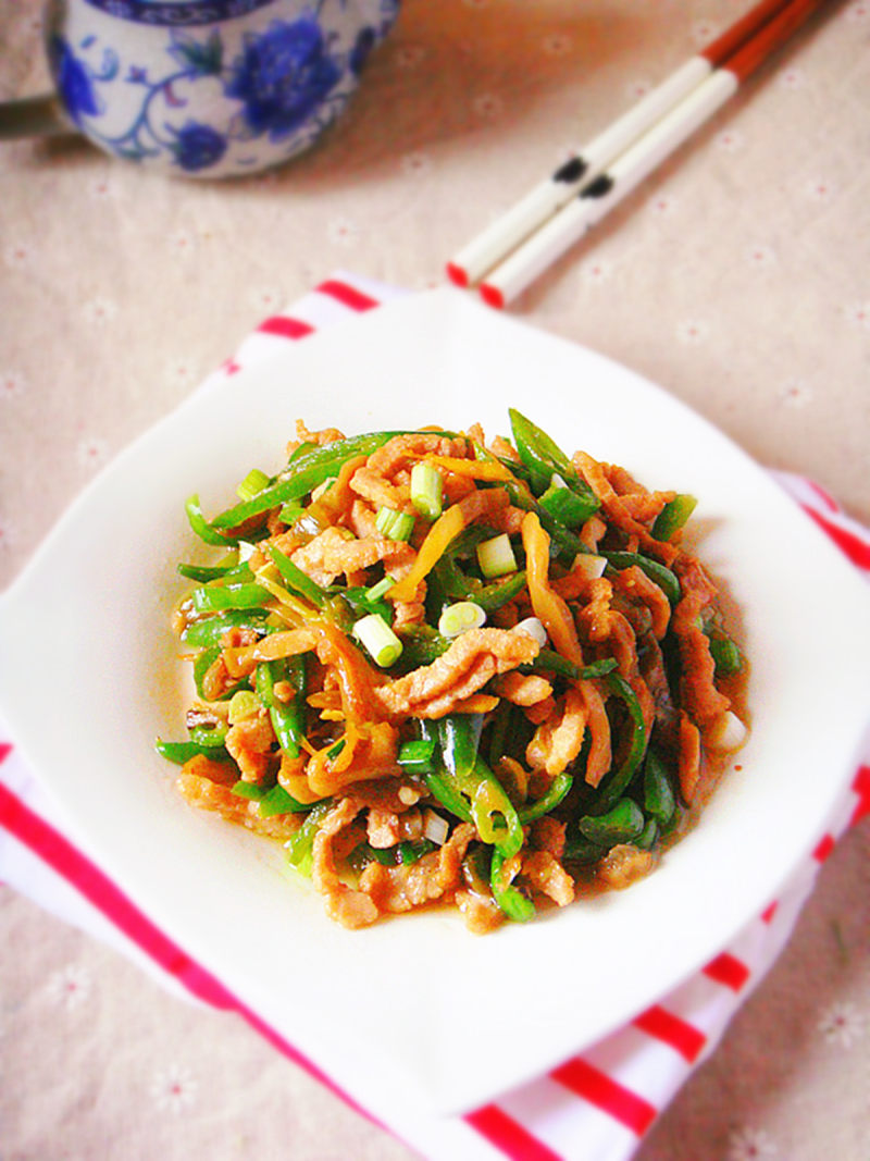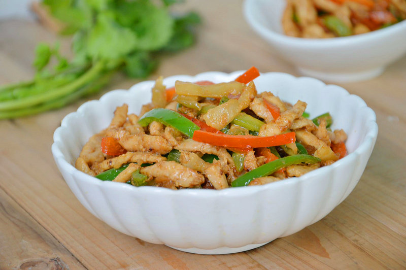 瘦肉丝腌一下会入味很多;当肉丝下锅后不久,青椒与榨菜丝翻炒几下便可