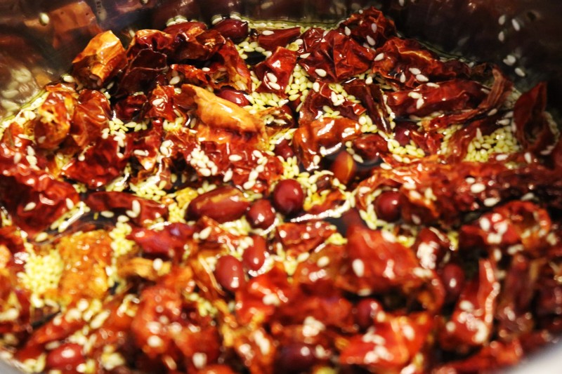 3:把油分几次淋在干辣椒和芝麻上面,并用筷子不停搅拌,加盐,最后放入花生米。香香的辣椒油就做好了,做凉拌菜、炒菜里放一点辣椒油是很好吃的!