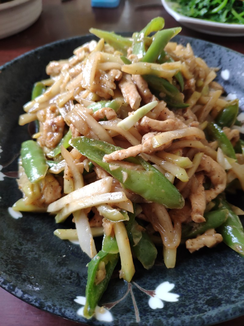 8:接着倒入青椒丝一起翻炒均匀,适量加点点盐