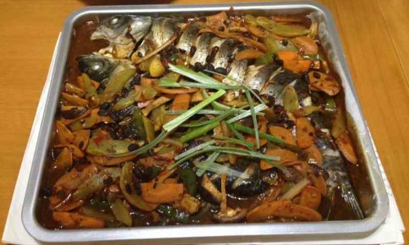 1:草鱼处理干净,从鱼背对半切开,身上打花刀,用盐腌制15分钟,然后所有调料放油里炸,把油刷到鱼身上,放入预热200度的烤箱烤20分钟