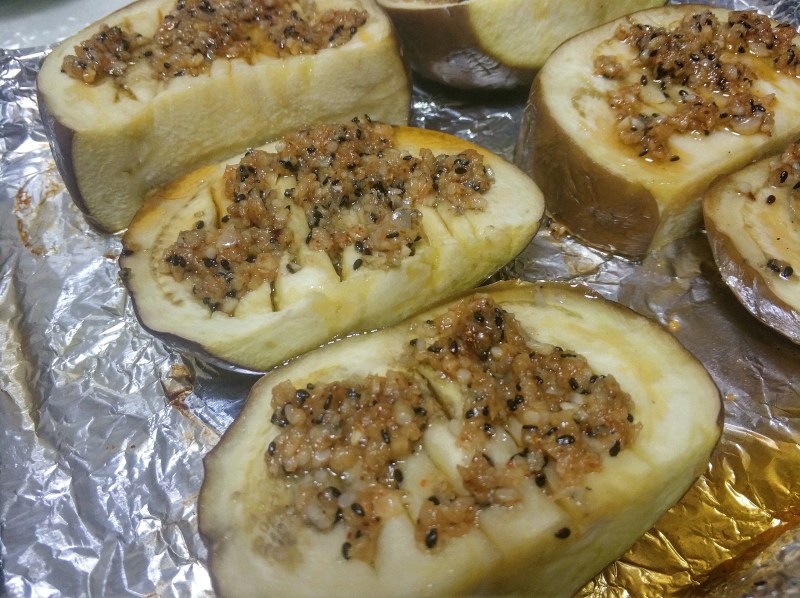 3:茄子烤10分钟后,把烤盘取出来,给茄子抹上蒜蓉辣椒和生抽调好的烤料,然后在进去烤大约10分钟。