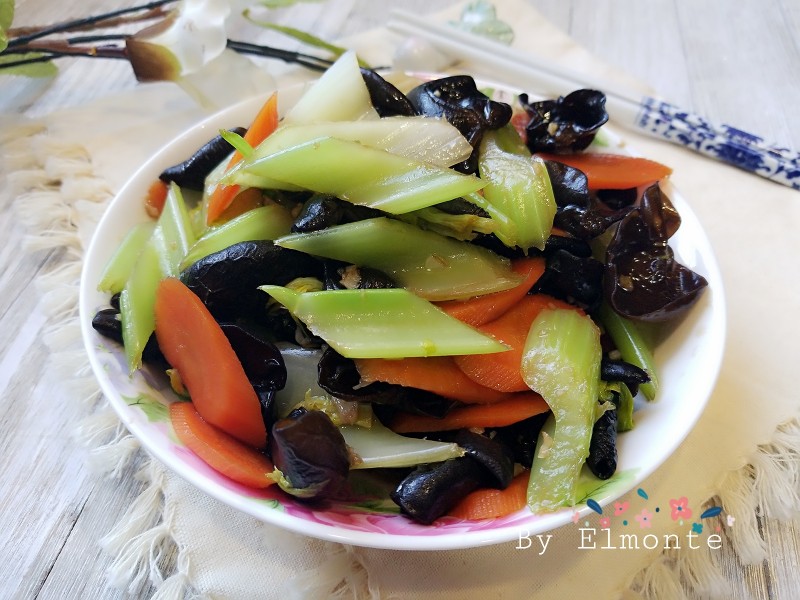 8:把西芹,木耳,胡萝卜放入大盘里。