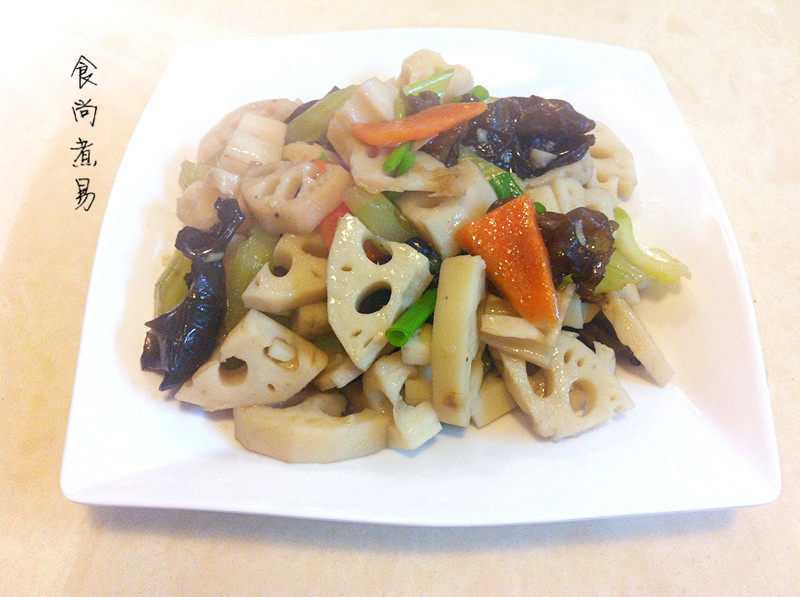 莲藕1小根;西芹2根;木耳5朵;大蒜1个;胡萝卜少许;
