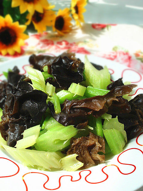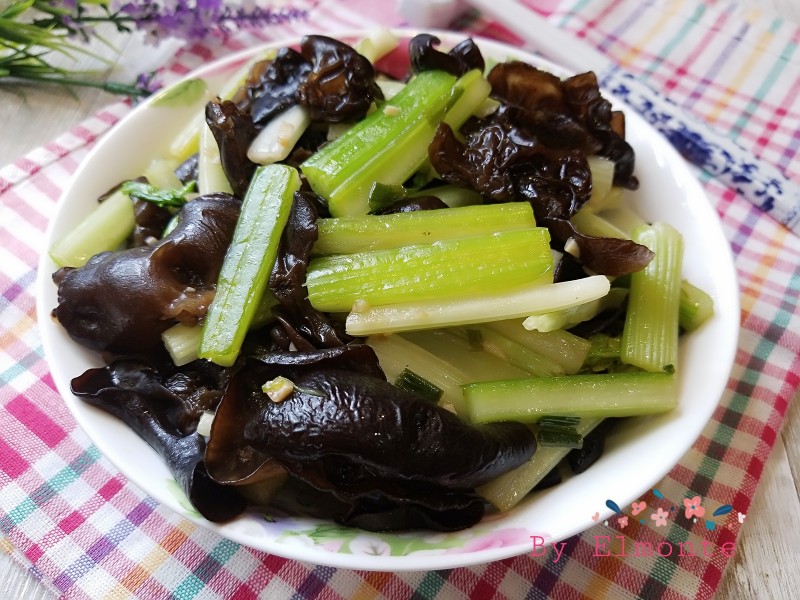 2:木耳泡发洗净,西芹撕去老筋洗净切小块备用。