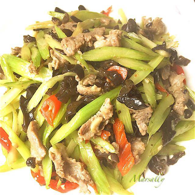 西芹1棵;木耳1克;五花肉1段;小米椒1个;
