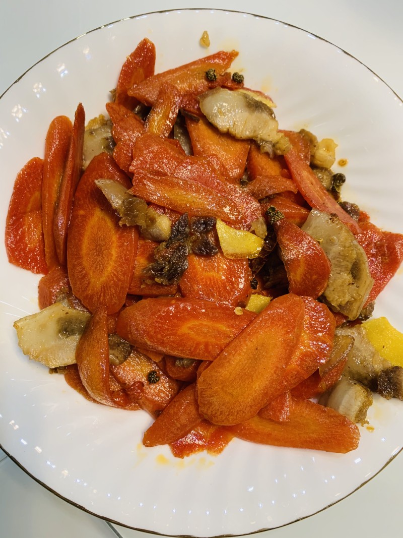 3:爆干了加入姜片,迅速加入备用的胡萝卜。