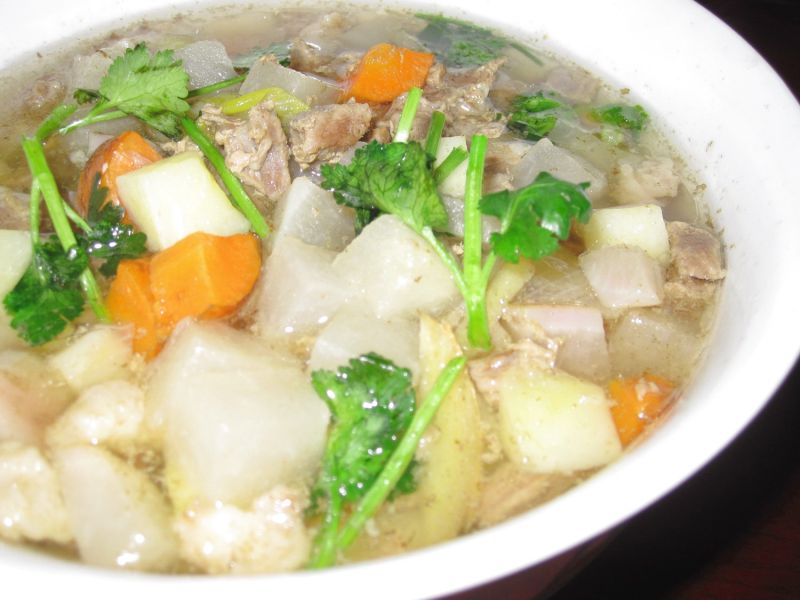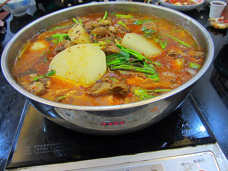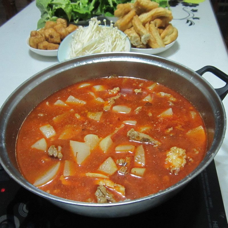 8:将炖洋排的汤倒进汤锅里或火锅里放点盐烧开,再放进焖熟的白萝卜,去好骨的洋肉,调进麻辣汁,鸡精,十三蚝烧开,再放进芹菜,大蒜带锅带火上桌,配上备好的配菜边吃边放。