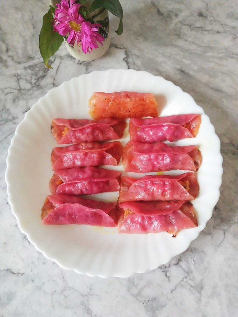 火龙果汁胡萝卜肉馅锅贴的做法步骤