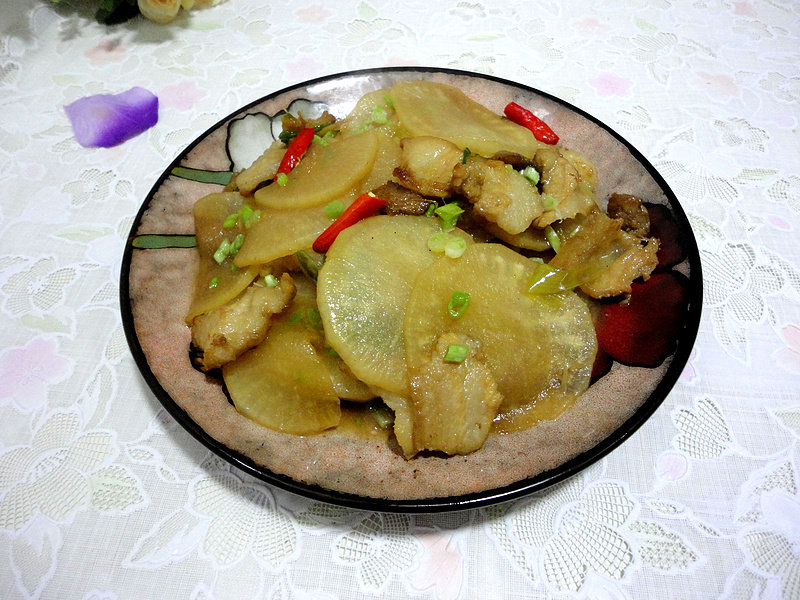5:白萝卜切片先放进烧好油的锅加盐炒匀,再将萝卜焖熟。