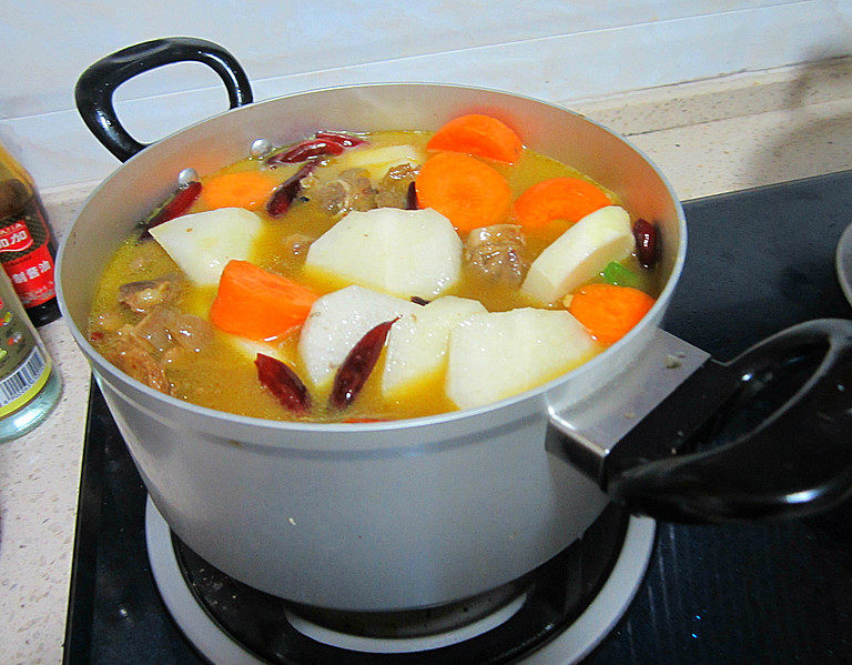 8:1个半小时后锅中加入萝卜。在闷煮30分钟。