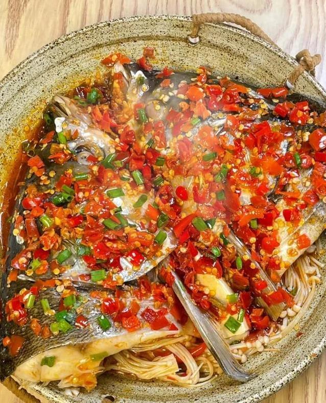 鱼头出锅前,撒一把葱花点缀,颜色好看又增香。盛到盘子里,鱼肉白嫩,剁椒红亮,金针菇和豆腐吸饱了汤汁,软糯又入味。端上桌,保准全家人都围过来抢着吃。