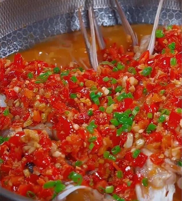 10分钟后,打开锅盖,鱼头已经被剁椒裹得红彤彤,汤汁冒着小泡,看得人直咽口水。用铲子小心翻个面,让鱼头另一边也吸满汤汁,再盖上盖子焖2分钟。别心急,这两分钟让味道更均匀。