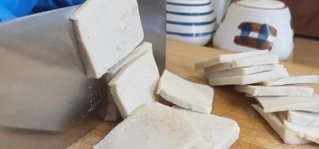 选一块新鲜的千页豆腐,切成薄片,大概两毫米厚。太厚嚼不动,太薄没口感,刚刚好最重要。切之前可以把豆腐放冰箱冷冻一会儿,硬一点更好切,刀工差的小伙伴也能轻松搞定。