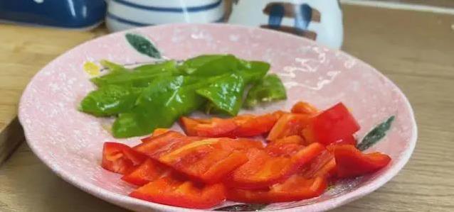 螺丝椒一根,切成滚刀块,脆爽又微辣,吃起来特别香。不爱辣的可以用青椒代替,味道一样好。红甜椒切点菱形片,主要是为了好看,颜色鲜艳让人有食欲,没红椒也可以跳过。