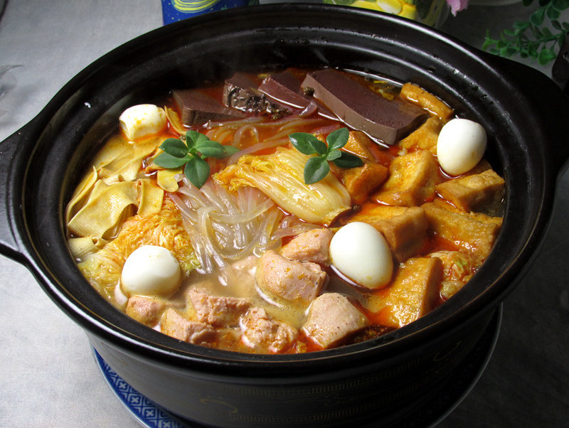 嫩豆腐200G;鸡胸肉200g;牛肉100g;豆腐皮100g;猪血300g;宽粉50g;娃娃菜2棵;
