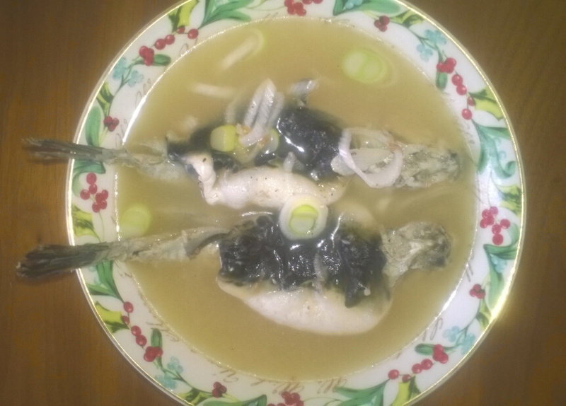 2:葱姜爆香后马上加入河豚,加适量热水,大火5分钟,加入鱼皮,小火10分钟,其间注意撇去浮沫
