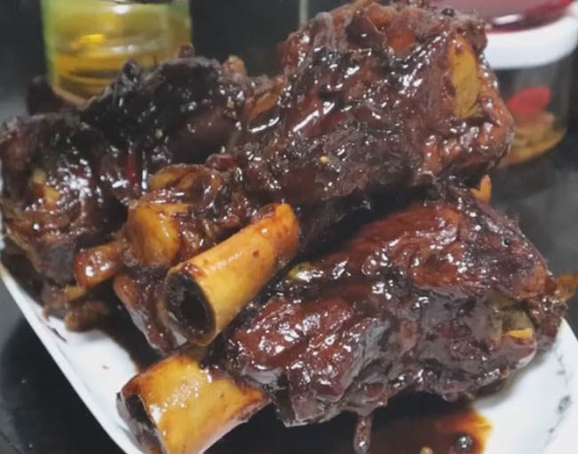 8:然后加入豚骨翻炒一下,加足量的水和炒好的糖水,料酒,老抽,蚝油,两勺豆瓣酱,盐,盖好盖子炖半个小时即可。