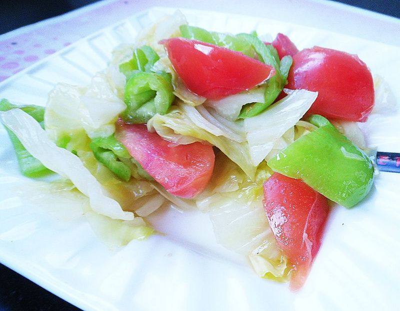 1:主辅料:圆白菜、尖辣椒、西红柿