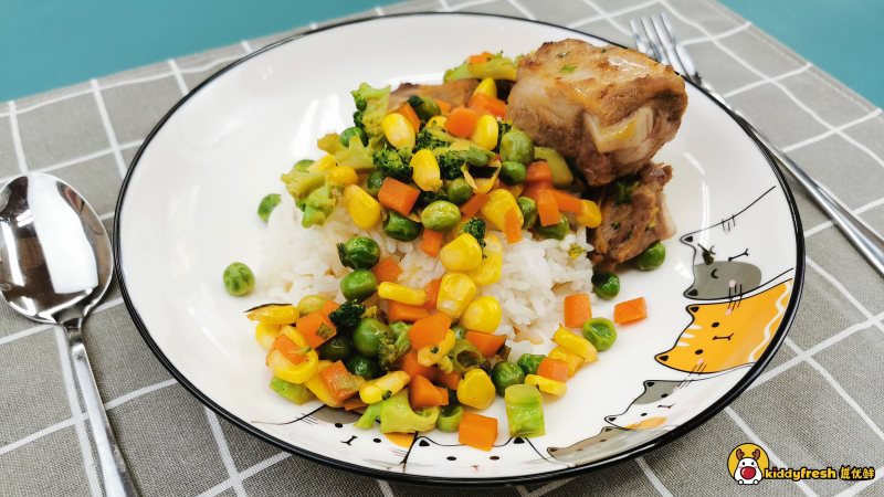 胡萝卜15g;豌豆10g;玉米粒10g;西兰花1朵;香葱适量;