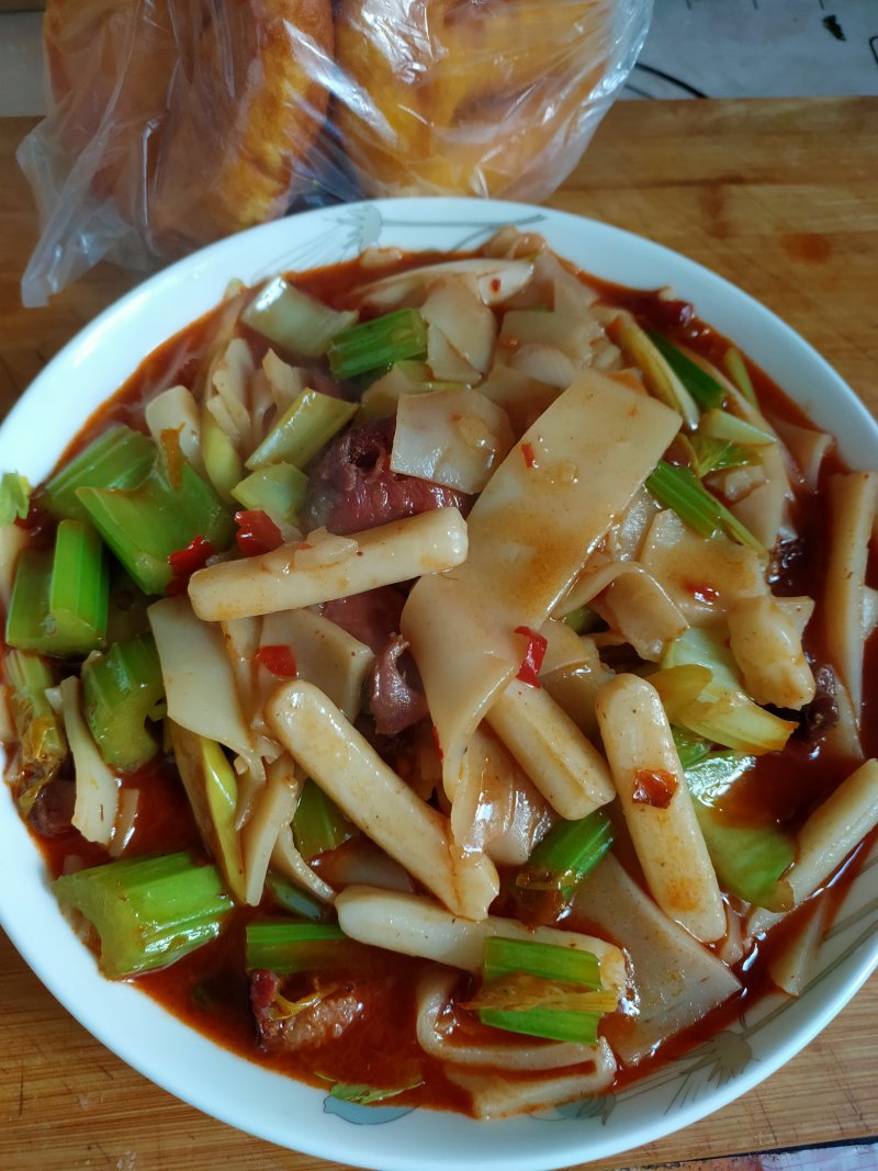 1:年糕提前用水煮10分钟,凉皮切条,马肉切块,芹菜切丁。