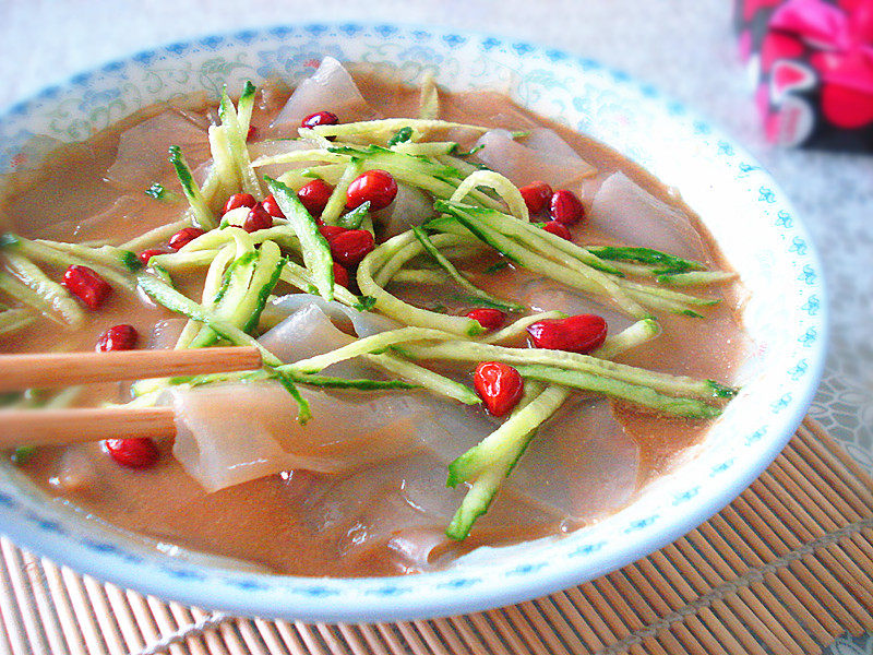 13:把凉皮切成自己喜欢的宽度,浇上刚才调好的汁,放上黄瓜丝、香菜,就可以开吃了。