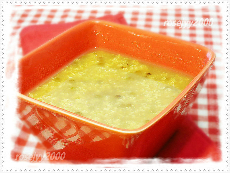 2:一次加入足量的清水,红豆、绿豆先加入,冷水上锅,大火煮开,转中小火把红豆、绿豆煮开花,再加入大米、小米,转大火煮开,再转中小火熬,熬出米油,加入水果玉米粒,再煮5分钟