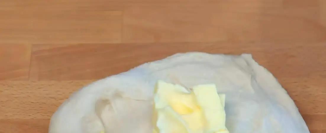冷藏后的面团拿出来,摊平,加入35克软化好的黄油。黄油得提前从冰箱拿出来放软,不然硬邦邦的不好揉。把黄油和面团使劲揉到一起,揉个5分钟,再盖上保鲜膜放回冰箱冷藏2分钟。拿出来后继续揉6分钟,揉到面团能拉出薄薄的透明膜为止。这一步很关键,揉到位了,面包才会松软有嚼劲!