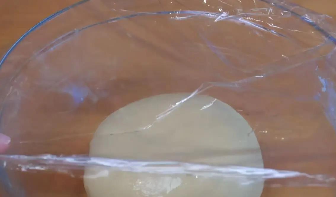 材料拌好后,找个大点的碗,装385克面粉。把刚才的混合液一股脑倒进去,边倒边搅拌。面团干湿得合适才行,太干了就加点水,太湿了就不好揉了。合适的面团应该是能粘在碗壁上,但轻轻一拉还能扯下来。开始用手揉吧,揉个两三分钟,直到面团表面光滑,手上和碗里都不沾面。揉好后,盖上保鲜膜,扔进冰箱冷藏20分钟。