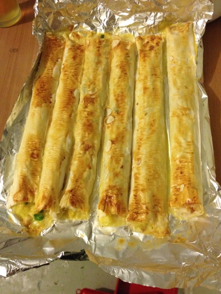 7:酥皮四层,一分为二。左边放培根,鸡蛋饼,cheese,葱花,卷起来,一共是6个都这样做。