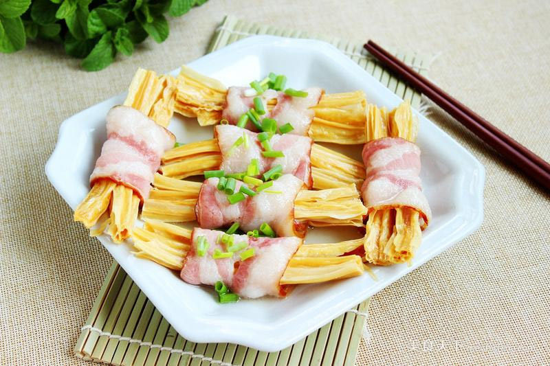 7:锅中放水煮开,放入腐竹培根卷蒸10分钟