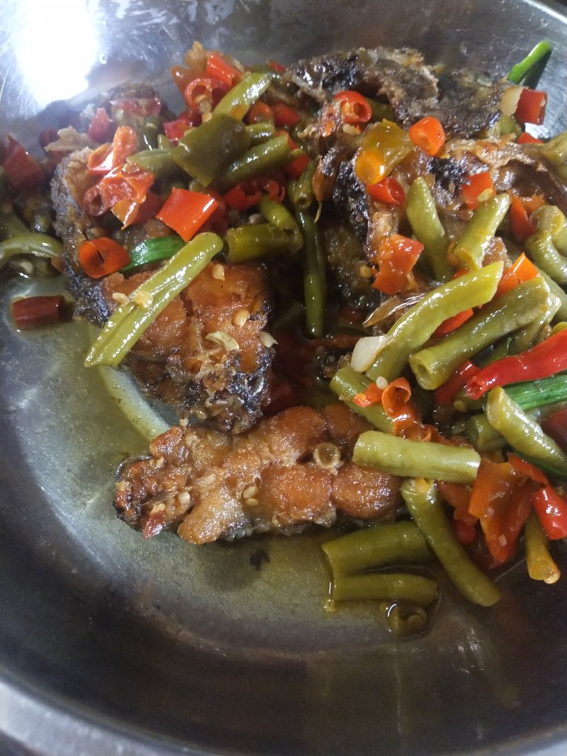 3:待锅底热后加入油待油热了后放入少许盐、酸辣椒、酸豆角小炒一会后加入味精再炒一下便将煎好备用的鱼倒入锅内翻炒一会加入水后盖上盖子待鱼收汁后即可盛出。