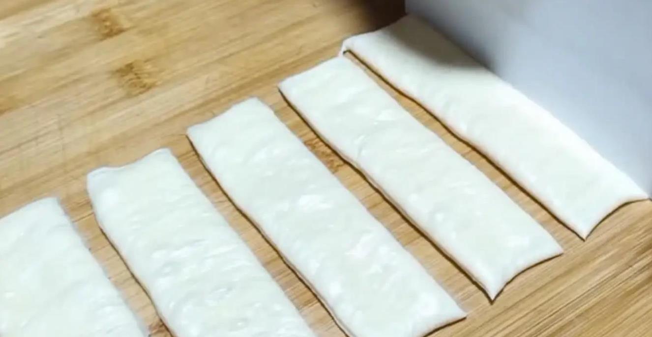 面团醒好后,案板上抹点油防粘。把面团搓成长条,按扁擀成皮。擀的时候别太使劲,皮太薄炸不出布袋形状。按自家锅的大小,切成小块。切好的面团中间可能会缩窄,拉的时候得先把两头扯细,再拉中间,保持宽度一致。