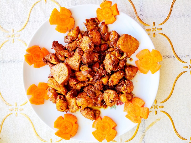 6:加入烧烤料,快速翻炒,鸡肉缩水,就可以收料汁,关火。
