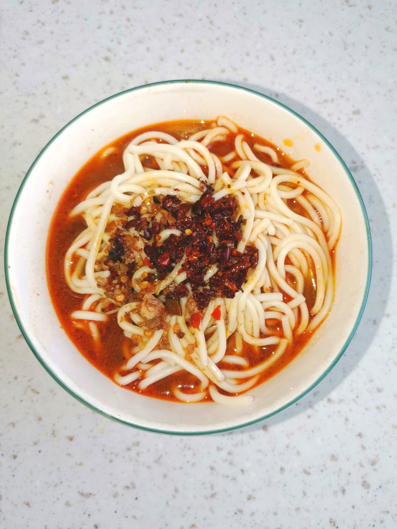 12:面条捞出,加入大盘鸡的汤和油辣椒即可。