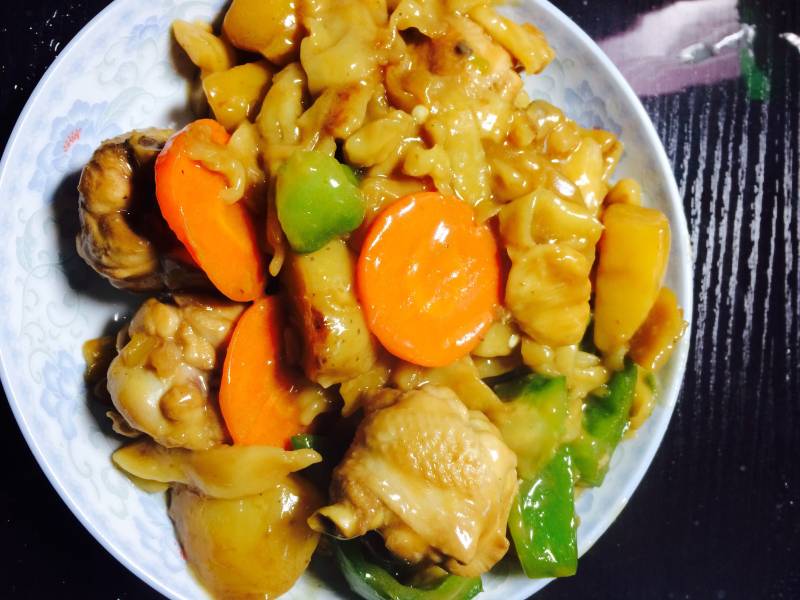 鸡块适量;面条半斤;胡萝卜半根;青椒1个;洋葱半个;土豆1个;