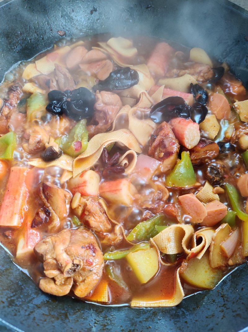 11:加水,料酒,煮开后放入西红柿,土豆,蘑菇,木耳,豆皮等,再煮开后放入青椒洋葱。