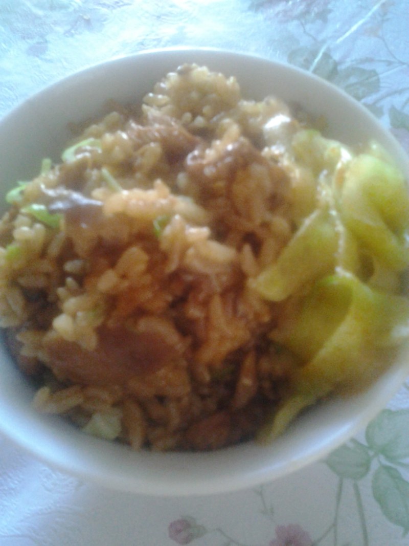 5:PS:米饭好了后稍焖片刻,之后放入事先备好的葱花均匀搅拌一下,香气扑鼻··米饭里的水要比平时少放,因为有肉汁和香菇的水份,做好了很香,绝对值得试试,也可以试试换做其他食材,下次我准备来个排骨煲饭!
