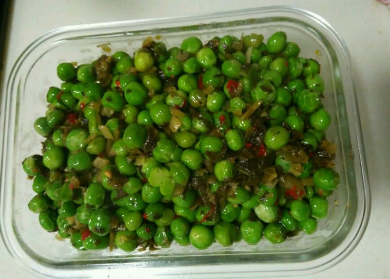 3:油锅下生姜米炒香,下入洗过的豌豆翻炒,一直炒到豌豆的嫩绿色变为深绿色
