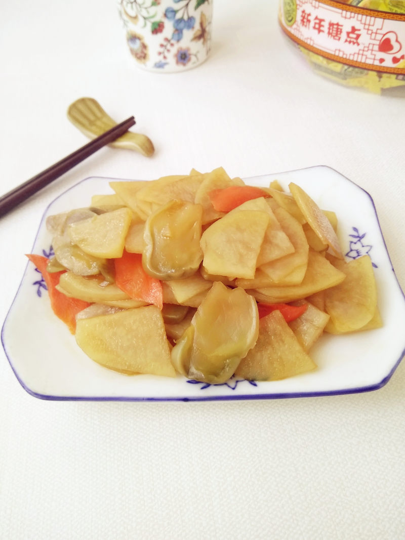 1:土豆去皮洗干净,胡萝卜洗干净,榨菜洗干净。