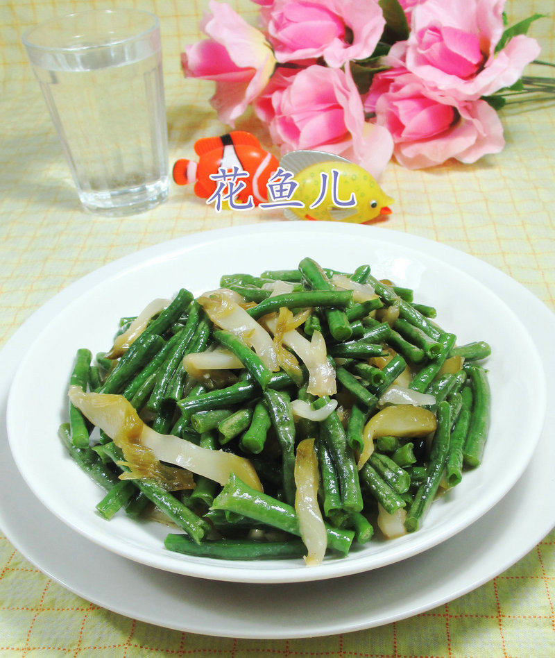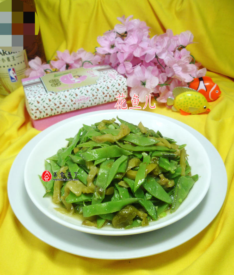4:烧锅倒油烧热,下入焯好的带豆和切好的榨菜翻炒翻炒。