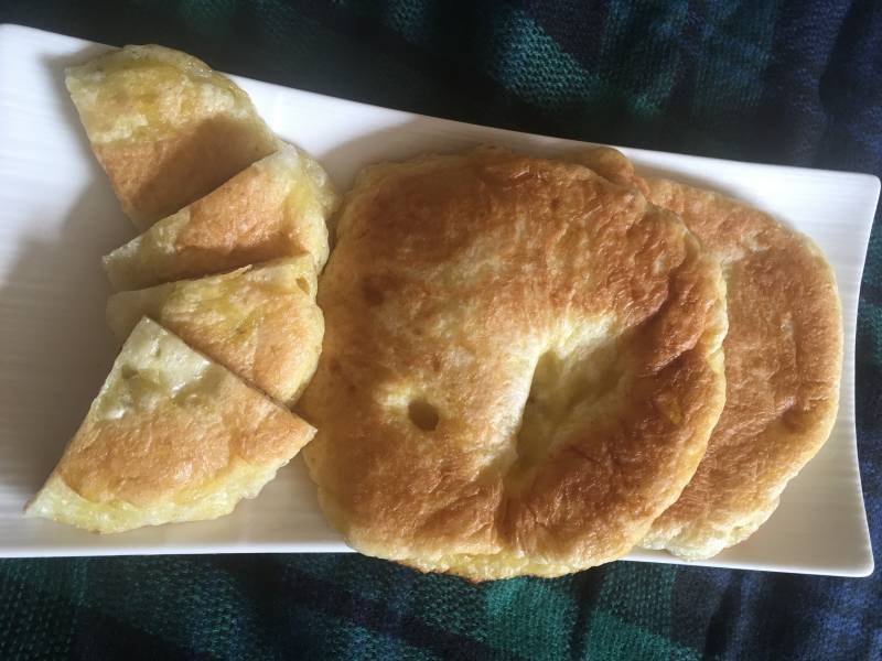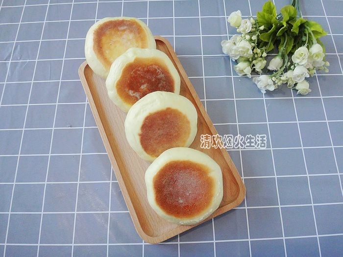 7:面饼烙两三分钟,烙定型后翻过来烙另一面,另一面也烙定型后往锅中撒少许水,盖上盖子,继续用小火将饼烙熟。两面都烙熟后就可以取出来食用。
