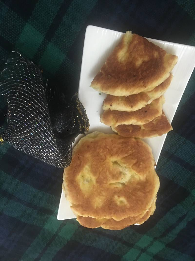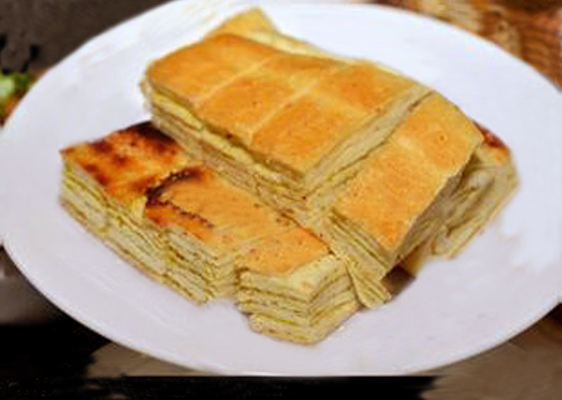 3:饼四周用手抻拉,中间一定要薄,否则中间不熟!翻面两面金黄即可