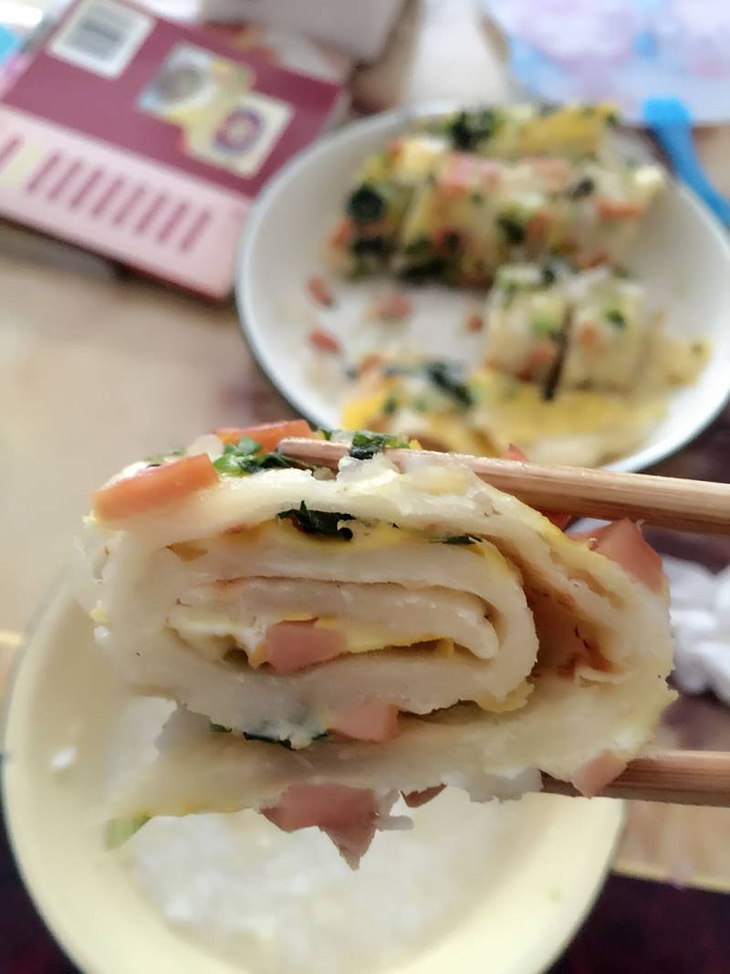 面粉适量;青菜适量;洋葱半个;玉米肠1根;鸡蛋3个;