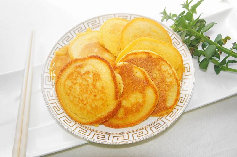 4:平底锅薄薄地刷底油,用大小适中的汤匙,舀一勺面糊放入锅中,轻轻压平,小火烙。看到每个小饼都有气泡产生,这就是小苏打的作用,小饼出锅特别松软。
